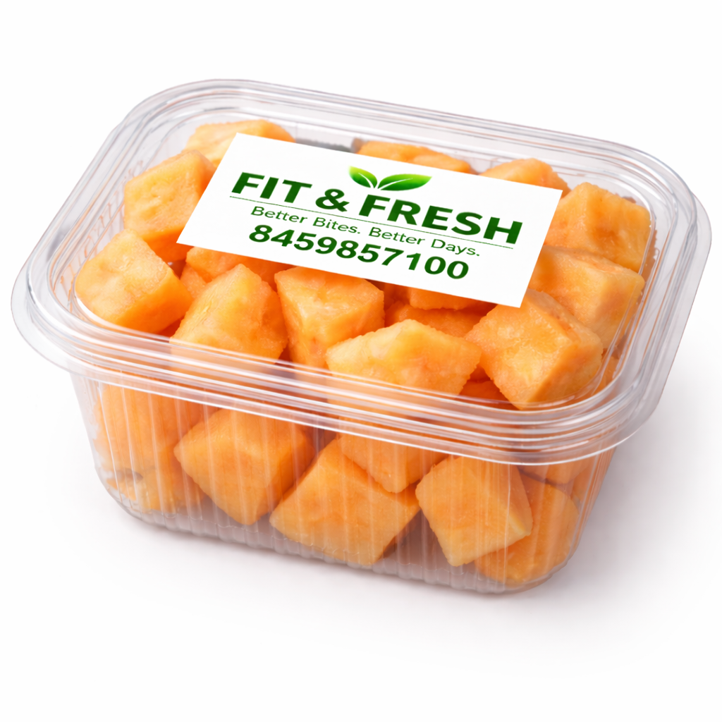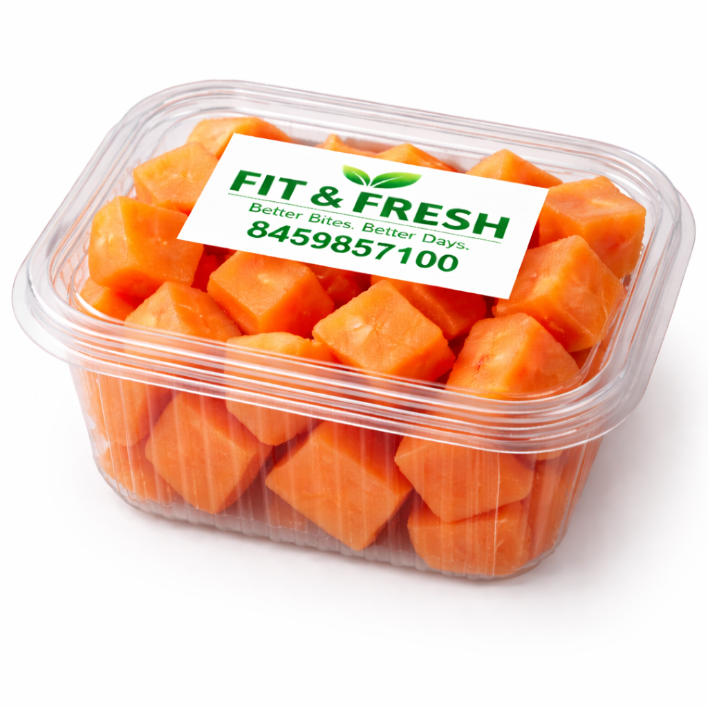 Freshly cut ripe papaya cubes, naturally sweet and rich in nutrients. Light, easy to digest, and perfect for a healthy start to your day.